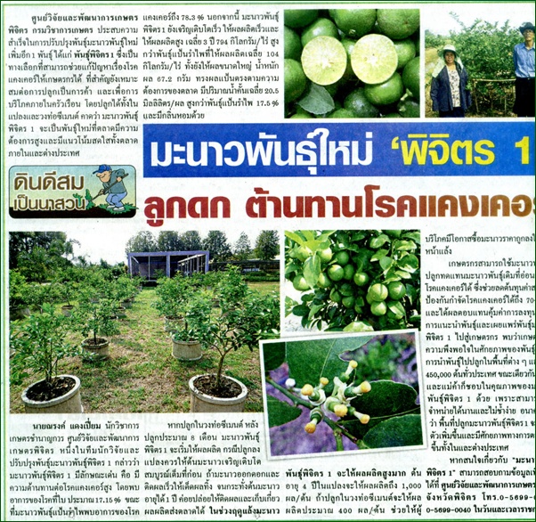 | มะนาวพันธุ์พิจิตร 1 เป็นมะนาวที่คัดเลือกได้จากการผสมพันธุ์ระหว่างพันธุ์มะนาวแป้นรำไพเป็นแม่กับพันธุ์น้ำหอมเป็นพ่อ ดำเนินการปรับปรุงพันธุ์ที่ศูนย์วิจัยและพัฒนาการเกษตรพิจิตร ตั้งแต่ปี พ.ศ.2539 - 2543 คัดเลือกต้นกล้าลูกผสมที่มีการเจริญเติบโตดี มีความต้านทานต่อโรคแคงเกอร์ไปปลูกเพื่อคัดเลือกพันธุ์ 300 สายพันธุ์ ได้ต้นที่ดีเด่น 7 พันธุ์ คือ B18, I17, J17, M1, M7, M9 และ M33 (พิจิตร 1) ปี พ.ศ. 2549 - 2553 นำสายพันธุ์มะนาวลูกผสมที่มีลักษณะดีเด่นที่ให้ผลผลิตสูง มีทรงผลแป้นและต้านทานต่อโรคแคงเกอร์ไปปลูกทดสอบพันธุ์ที่ศูนย์วิจัยและพัฒนาการเกษตรพิจิตร และศูนย์วิจัยพืชสวนสุโขทัย 2 พันธุ์ คือ B18 และ M33 โดยมีพันธุ์แป้นรำไพ และ L4 ซึ่งเป็นพันธุ์ลูกผสมจากพันธุ์แป้นรำไพกับพันธุ์หนังคันธุลี เป็นพันธุ์เปรียบเทียบ เมื่อมะนาวอายุ 4 ปี พบว่า มะนาวพันธุ์พิจิตร 1 มีคุณลักษณะต่างๆ ดีกว่าพันธุ์แป้นรำไพ มีความต้านทานต่อโรคแคงเกอร์โดยพบอาการของโรคที่ใบร้อยละ 17.15 ส่วนพันธุ์แป้นรำไพพบอาการของโรคสูงถึงร้อยละ 78.3 นอกจากนี้ยังมีการเจริญเติบโตเร็ว ทรงต้นสูงเฉลี่ย 219 เซนติเมตร พันธุ์แป้นรำไพสูงเฉลี่ย 121 เซนติเมตร ให้ผลผลิตเร็วและให้ผลผลิตสูงเฉลี่ย 3 ปี 794 กิโลกรัม/ไร่ พันธุ์แป้นรำไพให้ผลผลิตเฉลี่ย 104 กิโลกรัม/ไร่ ทรงผลแป้นตรงตามความต้องการของตลาด มีปริมาณน้ำคั้นเฉลี่ย 20.5 มิลลิลิตรต่อผล สูงกว่าพันธุ์แป้นรำไพร้อยละ 17.5 และมีกลิ่นหอม |